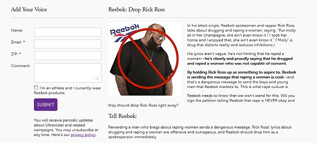 Organizacja UltraViolet pod swoją kampanią „REEBOK: DROP RICK ROSS” zebrała ponad sto tysięcy podpisów.