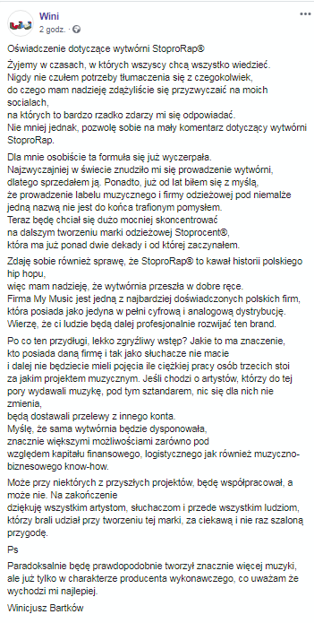 Szczere, pozbawione lukru oświadczenie, które niejako odzwierciedla marazm w jaki popadł ten label. Nie widziałem tam chęci, rewolucji, planu na przyszłość. Pociesza fakt, że Stoprocent jako marka odzieżowa zostaje w rękach Winiego i będzie dalej jego oczkiem w głowie.