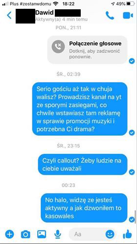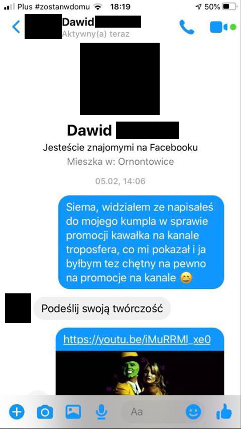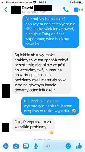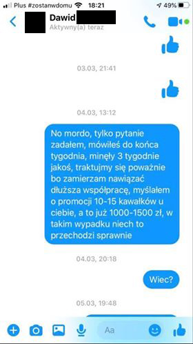Sytuacja bliźniacza. Znów problem z wrzuceniem, kręcenie, propozycja wrzucenia na kanał z 1 tysiącem subskrybcji (!!!!). Wiadomości pochodzą z 25 lutego i jak łatwo się domyślić – żadnego kontaktu ani wrzutki do dziś.