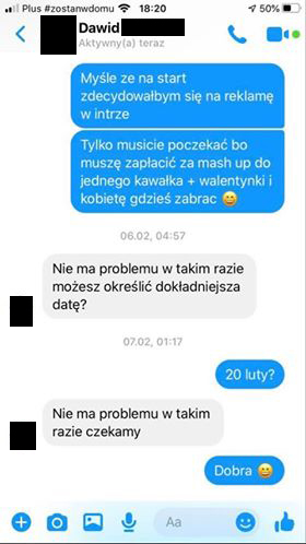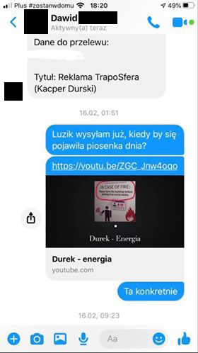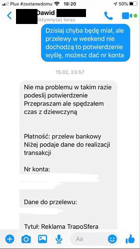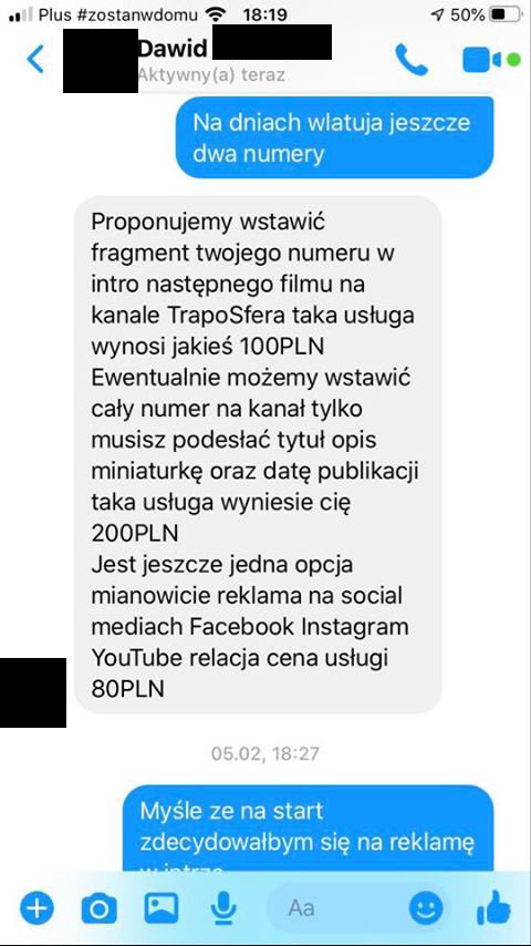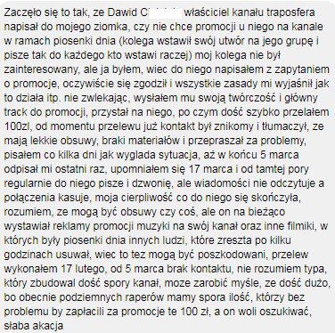 Był zainteresowany wrzuceniem swojego kawałka do intra kolejnego filmiku jaki pojawi się na kanale TRAPOSFERA. Mamy 5 lutego. Wszystko odbywa się zgodnie z planem – Panowie wymieniają się uprzejmościami, Kacper wysyła potwierdzenie przelewu na 100 ZŁ (tyle kosztuje taka usługa w cenniku TRAPOSFERY). Potwierdzenie przelewu zostaje wysłane 17 LUTEGO. Po dokonaniu wpłaty zaczynają się schody – najpierw zbywanie, potem całkowita olewka i unikanie kontaktu. Mamy dzisiaj 11 KWIETNIA – wrzutki nie ma nadal.