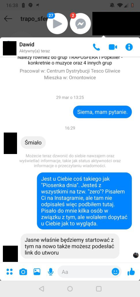 W skrócie – Kacper napisał do Dawida Cielniaka – właściciela TRAPOSFERY. 5 LUTEGO.