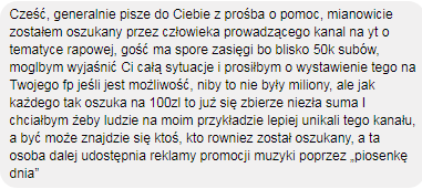 Nie chcemy wywoływać afer ani gównoburz, ale w momencie gdy oszukiwani ludzie zgłaszają się do nas, mając jasne dowody – nie możemy pozostać na takie sytuacje bierni. Tu już nawet nie chodzi o to, czy zainteresowany wrzuci, czy nie wrzuci. Chodzi o sam fakt, że od 1,5 miesiąca zalega z usługami, które sam proponował, za które wziął pieniądze. Nie ma u niego żadnych skrupułów, skoro olewa wiadomości i nie poczuwa się w najmniejszym stopniu do tego, by wytłumaczyć się głównym zainteresowanym.